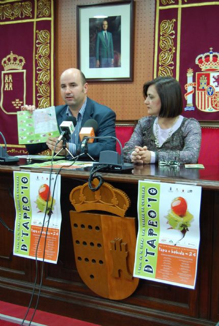 En la mañana de hoy jueves 11 de noviembre la primera teniente de alcalde de Las Torres de Cotillas, Fina Almela, y el concejal de Comercio local, Alfonso Sandoval, han presentado de manera oficial la "I Ruta de la Tapa de Las Torres de Cotillas · D'Tapeo 2010", una propuesta que comienza mañana viernes 12 de noviembre y que se alargará hasta el próximo domingo 12 de diciembre. Para esta ruta gastronómica, en la que participarán 17 establecimientos hosteleros repartidos por todo el municipio, se ha fijado en dos euros el precio de la tapa más la bebida (cerveza, vino, refresco o agua) y a su conclusión se sortearán diversos premios entre los consumidores.