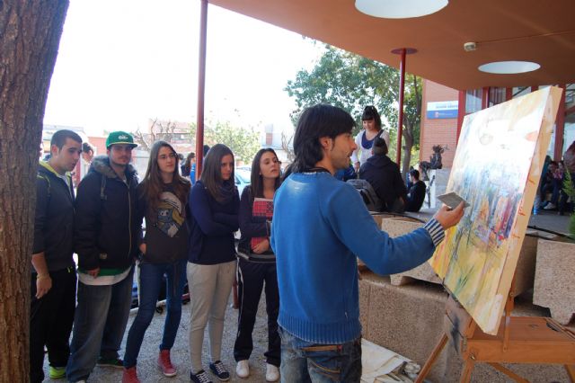 Los alumnos del IES "Salvador Sandoval" de Las Torres de Cotillas vivieron el pasado miércoles 29 de febrero una experiencia didáctica inolvidable de la mano de uno de sus profesores, Miguel Mellado. Y es que los cerca de un centenar de alumnos de las asignaturas de "Imagen y Comunicación" (1° de Bachillerato) y de "Plástica" (1° de la ESO) de este docente compartieron con Mellado una clase en el patio del instituto, donde su profesor hizo gala de sus dotes como pintor –atesora más de cien galardones en concursos nacionales de pintura- y plasmó en uno de sus lienzos la fachada del centro y su entorno. Esta obra servirá para ilustrar la portada de la revista "El tubo", una publicación que edita el IES "Salvador Sandoval" y donde colaboran con contenidos como noticias, artículos, relatos y reportajes tanto el personal docente como el alumnado del centro de enseñanza.