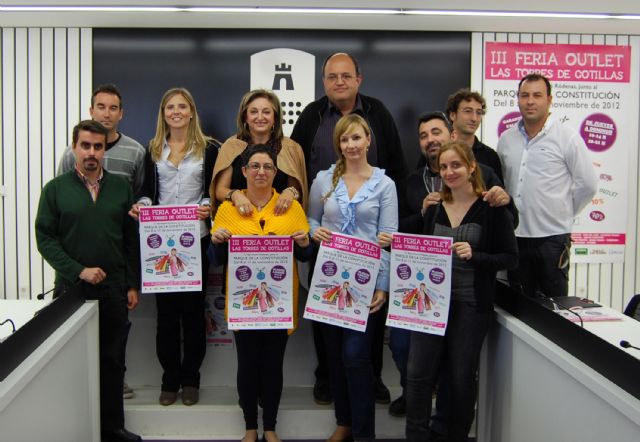 La "III Feria Outlet" de Las Torres de Cotillas ha sido presentada en la mañana de hoy lunes 5 de noviembre por la concejala de Comercio torreña, Inmaculada Fernández, y el presidente del "Área Comercial Las Torres", Francisco Juan Jiménez, en el Salón de Plenos del Ayuntamiento local. Esta feria del descuento se celebrará entre los próximos jueves 8 y domingo 11 de noviembre (de 10 a 14 horas y de 16 a 21 horas) en la calle Bartolomé Ródenas, junto al Parque de la Constitución local y en ella participarán los siguientes comercios torreño: "New Corpore Sport", "Calzados Juani´s", "Lucía Martínez Creaciones", "Deportes Marathon", "Rosa Del Cano", "Calzados Pisadas", "D´Fabula", "Iluminación Y Regalos J. Leal", "10 En Punto Tiendas", "Farmassana", "Kebana Floristería", "Fernández Palazón Joyeros", "Deportes Shepherd", "Somos Peques", "A.M.C.", "Calzados Peretón", "Modas Frasán", "Thermomix", "Colchonería D´Haro y D´Nanos La Casita Del Bebé", "Muebles Sepúlveda" y "Verabril".