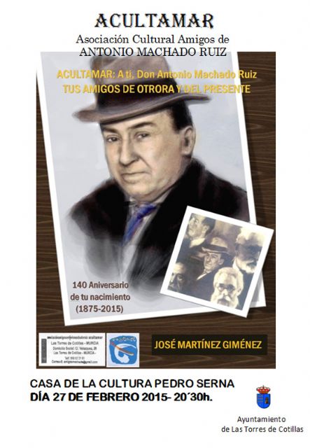 La Concejalía de Cultura de Las Torres de Cotillas enfila la recta final de su programación cultural de febrero y para mañana viernes 27 de febrero (20 horas) tiene fijada en el calendario la cita literaria "A ti, Don Antonio Machado Ruiz. Tus amigos de otrora y del presente". La velada correrá a cargo de la asociación cultural "Acultamar", que elegirá la Casa de la Cultura "Pedro Serna" para celebrar este acto con entrada gratuita que homenajeará el inmortal escritor sevillano con motivo del 140° aniversario del nacimiento.