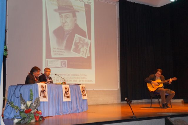 El pasado viernes 27 de febrero la asociación cultural "Acultamar" celebró en la Casa de la Cultura "Pedro Serna" de Las Torres de Cotillas la cita literaria "A ti, Don Antonio Machado Ruiz. Tus amigos de otrora y del presente". Una velada con entrada gratuita concebida para homenajear el inmortal escritor sevillano con motivo del 140° aniversario del nacimiento. Dirigida por el presidente de la citada asociación, José Martínez (conocido popularmente en la localidad como "el Lali") y el periodista Juan Tomás Frutos, el acto se enmarcaba en la programación propuesta en el municipio por la Concejalía de Cultura torreña.