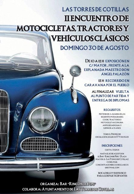 El municipio de Las Torres de Cotillas será escenario el próximo domingo 30 de agosto de la segunda edición de su "Encuentro de motocicletas, tractores y vehículos clásicos". Organizado por el bar "Rincón de Pepe" en colaboración con el Ayuntamiento local, esta cita comenzará a las 10 horas con una exposición en la calle Mayor frente a la Explanada Maestro Don Ángel Palazón. Allí los asistentes podrán deleitarse de manera gratuita y de cerca con estos modelos, cuyo principal requisito es contar con más de 35 años de antigüedad.