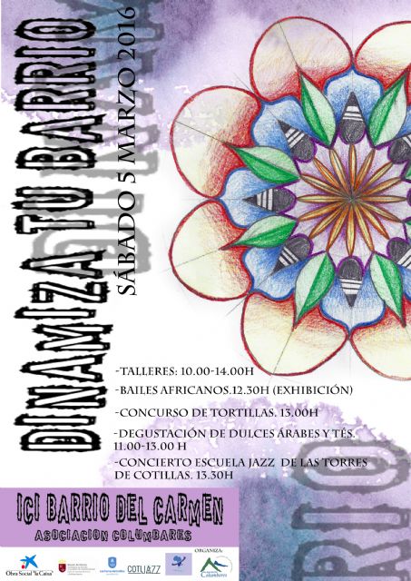 El barrio del Carmen de Las Torres de Cotillas presenta mañana sábado 5 de marzo las jornadas "Dinamiza tu barrio", organizadas por la asociación "Columbares" en colaboración con la Concejalía de Servicios Sociales, la "Asociación de Vecinos del barrio del Carmen" y la "Asociación de Mujeres Senegalesas de Las Torres de Cotillas" (AMSET). Estas actividades comenzarán a las 10 horas con unos talleres que durarán toda la mañana, mientras que a las 12'30 horas se celebrará una exhibición de bailes africanos será la protagonista de la mañana. También a esa hora se producirá la visita de la concejal de Servicios Sociales, María Dolores Sánchez, junto con la directora de la asociación "Columbares", Rosa Cano.