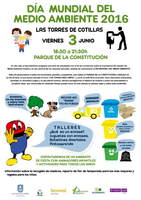 Llega el "Día Mundial del Medio Ambiente" y el municipio de Las Torres de Cotillas se prepara para celebrarlo por todo lo alto. Como todos los años, la Concejalía de Medio Ambiente ha organizado en el Parque de la Constitución una gran feria en la que, bajo el nombre de "Las Torres Más Limpia", se realizarán diversas actividades para concienciar sobre la importancia del respeto del medio ambiente urbano y del uso racional de los recursos naturales.
