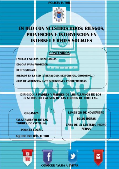 Los padres y madres de los alumnos de los centros educativos de Las Torres de Cotillas son los destinatarios de la charla "En red con nuestros hijos: riesgos, prevención e intervención en Internet y redes sociales", que tendrá lugar mañana lunes 28 de noviembre (19'30 horas) en la Casa de la Cultura "Pedro Serna" del municipio. Organizado por el Ayuntamiento local y el equipo "Policía Tutor" de la Policía Local de la población, esta iniciativa contará con asistencia libre y gratuita.