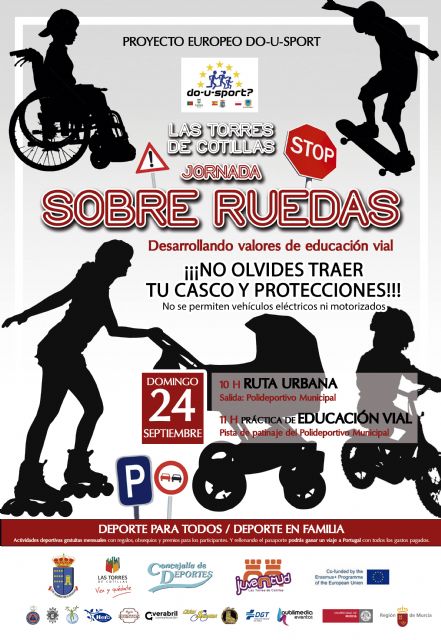 El próximo domingo 24 de septiembre Las Torres de Cotillas vivirá una 'Jornada sobre ruedas', en el marco del proyecto europeo 'Do-U-Sport'. Organizado por la Concejalía de Actividad Física y Deportes, este evento -que cuenta con el lema 'Desarrollando valores de educación vial' comenzará a las 10 horas con una ruta urbana que saldrá desde el polideportivo municipal. "Están citados todos los deportistas que desarrollen disciplinas sobre ruedas, como bicicletas, patines, patinetes, monopatines, carricoches, etc.", señala el concejal del área, Ginés Pérez, que señala que están excluidos de la convocatoria los vehículos motorizados.