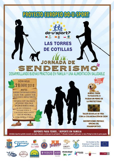 Nueva propuesta del proyecto europeo 'Do-U-Sport' en Las Torres de Cotillas. Será el próximo domingo 28 de enero, para el que la Concejalía de Actividad Física y Deportes ha programado una jornada de senderismo bajo el lema 'Desarrollando buenas prácticas en familia y una alimentación saludable'. Será la sexta cita de esta propuesta de actividades deportivas gratuitas en familia que cada mes se está desarrollando con este proyecto, en el que los participantes reciben regalos, obsequios y premios. "En esta ocasión planteamos una ruta de ida y vuelta entre el albergue municipal y la Contraparada, con salida a las 10 horas, vuelta a las 14 horas y una distancia total de 8 kilómetros", explica el concejal del área, Ginés Pérez.