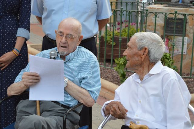 Tras la apertura del acto que corrió a cargo del popular poeta torreño Salvador Sandoval, se procedió -como todos los años- a la ofrenda de una corona de laurel en el monumento al huertano. "Es un reconocimiento a nuestras raíces, un bonito gesto que todos los años hacemos a esas personas que han ido conformando el pueblo que somos hoy", explica Zapata, que realizó la dedicatoria junto a García, que cumple 100 años en septiembre.