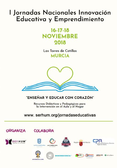 Mañana viernes 16 de noviembre comienzan en Las Torres de Cotillas las jornadas nacionales de innovación educativa 'Enseñar y educar con corazón,' que organizan la 'Plataforma Serhum' (www.serhum.org) y el colegio 'Susarte' del municipio. Éstas, que concluirán el próximo domingo, también cuentan con la colaboración de la Consejería de Educación, a través del Centro de Profesorado y Recursos (CPR). Una propuesta cuyo acto de inauguración tendrá lugar a las 17 horas, presidido por el concejal de Educación, Pedro Cabrera, cuya área también colabora en la iniciativa.