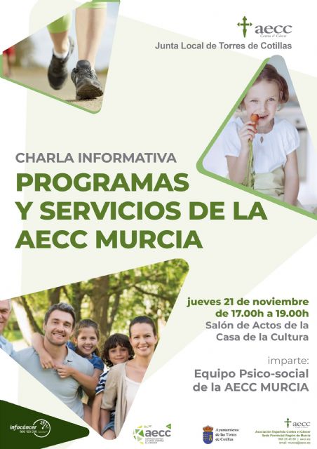 La junta local de la Asociación Española Contra el Cáncer (AECC) en Las Torres de Cotillas celebra mañana jueves 21 de noviembre (17 horas) una charla informativa en la Casa de la Cultura 'Pedro Serna'. Con entrada gratuita y la colaboración del Ayuntamiento torreño, esta actividad impartida por el equipo psico-social de la AECC Murcia tendrá como objetivo mostrar los programas y servicios de esta asociación.