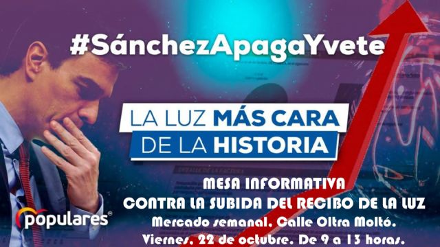 Con esta mesa informativa de carácter divulgativo los populares de Las Torres de Cotillas escucharán a autónomos, empresarios y vecinos, les explicarán su planteamiento para abaratar la factura y denunciarán la "parálisis" del Ejecutivo de Pedro Sánchez para ofrecerle salidas solventes a este drama.