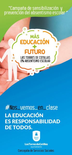 El Ayuntamiento de Las Torres de Cotillas ha lanzado una campaña para luchar contra el absentismo y el abandono escolar en la localidad. Con el lema "La educación es responsabilidad de todos. Más educación, más futuro. 0% Absentismo Escolar", esta acción cuenta con cartelería de pequeño formato y folletos que serán distribuidos en todos los centros escolares y dependencias municipales.