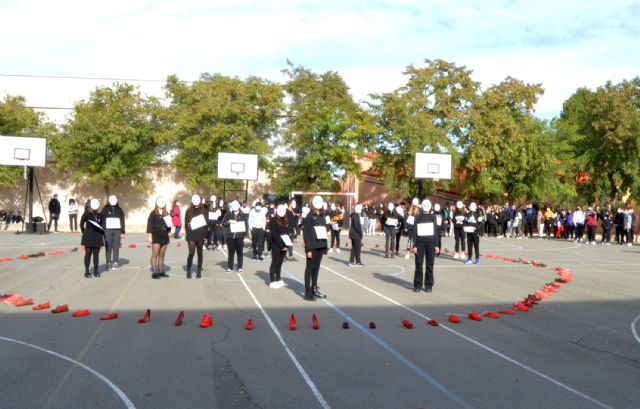 Para ello, un grupo de estudiantes ha realizado una perfomance en la que, dentro de un icónico círculo de zapatos rojos y ataviados con máscaras y un cartel con nombres femeninos sobre su pecho, han representado a las víctimas de esta lacra social. Además, otros alumnos han leído un texto de concienciación al resto del alumnado y al profesorado presentes.