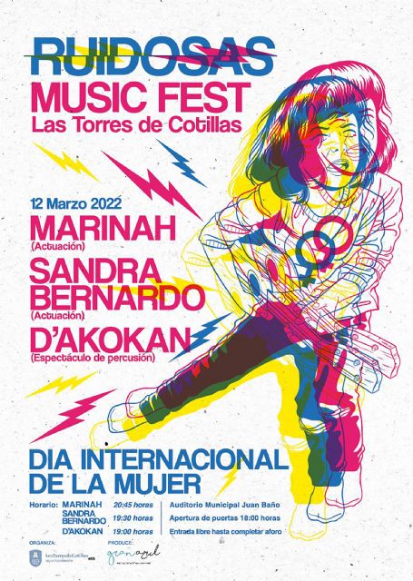 El próximo 12 de marzo (19:30 horas) llega a Las Torres de Cotillas el Ruidosas Music Fest, encabezado por la cantante Marinah, durante diez años cantante de la popular banda Ojos de Brujo. Organizado por la Concejalía de Igualdad con motivo de la conmemoración del Día Internacional de la Mujer, el festival contará también con la actuación de la madrileña Sandra Bernardo y el espectáculo de la agrupación de percusión murciana D'Akokan.
