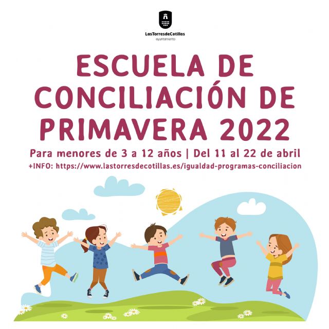 La Concejalía de Igualdad de Las Torres de Cotillas ha abierto el plazo de inscripción para la Escuela de Conciliación de Primavera destinada a menores de 3 a 12 años, que se llevará a cabo en el colegio Joaquín Cantero. "El número de plazas ofertadas es de 75 en total: 30 para menores de 3 a 6 años y 45 para menores de 7 a 12 años", indica la concejala María del Mar Ruiz Rosillo, que recuerda que los asistentes disfrutarán de diversas actividades lúdico-educativas.