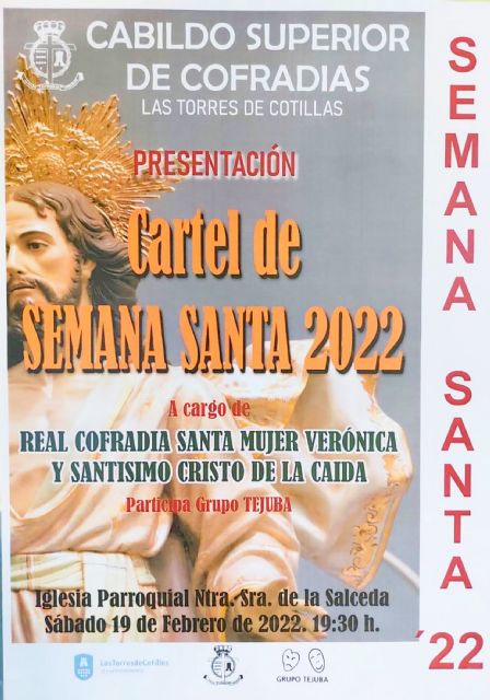 El Cabildo Superior de Cofradías de Las Torres de Cotillas presentará mañana sábado 19 de febrero (19:30 horas) el cartel de la Semana Santa 2022 del municipio. Este acto tendrá lugar en la iglesia de Nuestra Señora de la Salceda, como es tradición, y contará con la asistencia de la presidenta de la entidad, Ángeles Sola Sánchez, del alcalde torreño, Francisco Jesús López Manzanera, y del concejal de Cultura, Antonio Contreras Martínez.