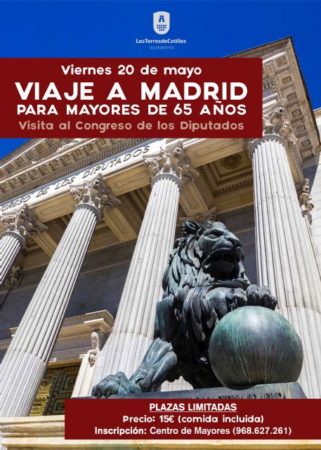 La Concejalía de Mayores de Las Torres de Cotillas ha organizado para el próximo viernes 20 de mayo un viaje a Madrid para mayores de 65 años, cuyo principal objetivo será visitar el Congreso de los Diputados. Con plazas limitadas, esta actividad tiene un coste de 15 euros por persona e incluye el desplazamiento de ida y vuelta en autobús, y la comida. Las inscripciones se pueden realizar ya en el centro social de mayores (968.627.261).
