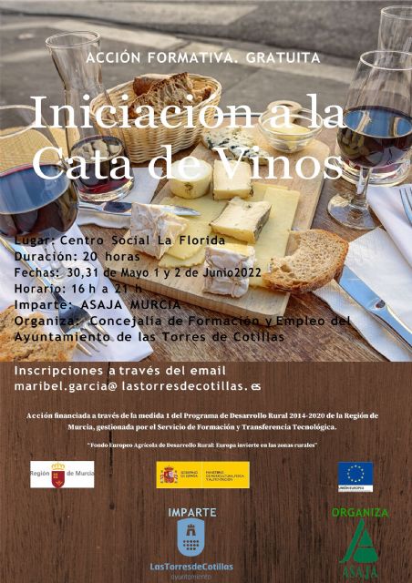 La Concejalía de Formación y Empleo de Las Torres de Cotillas ha organizado una nueva edición del curso gratuito "Iniciación a la cata de vinos", que tendrá una carga lectiva de 20 horas. Esta acción formativa cuenta con plazas limitadas y se desarrollará en el Centro Social durante cuatro jornadas (30 y 31 mayo, y 1 y 2 de junio) en horario de 16:00 a 21:00 horas.
