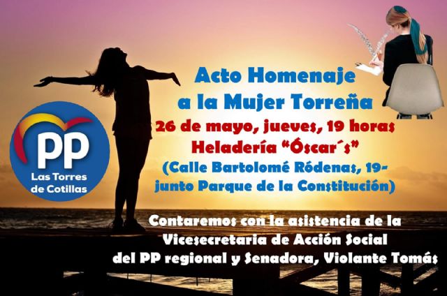 El PP torreño homenajeará este próximo 26 de mayo, jueves (19 horas), en la Heladería "Óscar´s" del municipio, a una representación de mujeres vinculadas con la localidad por su trayectoria y labor de engrandecimiento del buen nombre de la población y su contribución a una sociedad más justa, avanzada e igualitaria.