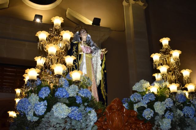 La imagen de la Virgen de los Dolores resplandeció vestida de rosa palo y brocado metálico, con un manto azul noche bordado a mano en los talleres de Lorca, llenando de devoción a todos los vecinos que presenciaron hizo su recorrido habitual por las calles del municipio.
