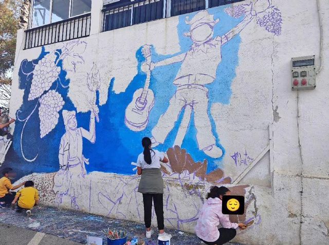 Esta explanada, donde habitualmente se planta este gran ninot que homenajea el pasado huertano de la localidad, ha sido escenario durante varias semanas de estos trabajos artísticos, a los que solo le quedan unos pequeños detalles. En estas labores -coordinadas por el muralista e ilustrador Eduardo Tomás- han colaborado los menores del programa 'Dinamiza tu barrio' que Columbares realiza en el barrio del Carmen.