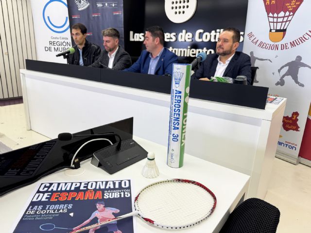 Este próximo fin de semana el pabellón municipal Mireia Belmonte de Las Torres de Cotillas acogerá el campeonato nacional sub-15 de bádminton. Un total de 120 participantes disputarán este torneo 29 y 30 noviembre, y 1 de diciembre, con asistencia gratuita para el público. Un campeonato que ha sido presentado hoy por el alcalde torreño Pedro José Noguera, que ha estado acompañado del director general de Deportes, Fran Sánchez, y del concejal de Deportes, Sergio Jornet.