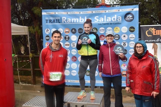 Una gran jornada deportiva a pesar del mal tiempo. Eso vivieron ayer domingo 2 de marzo los 430 inscritos en la III Trail Rambla Salada de Las Torres de Cotillas, que desafiaron a la lluvia y las bajas temperaturas para disfrutar de un recorrido que discurría por senderos, caminos y pistas forestales del entorno de la Rambla Salada. La cita estaba organizada por la Concejalía de Deportes, con la colaboración de la Federación de Atletismo de la Región de Murcia (FAMU) y NatureFit, y formaba parte de la liga de carreras "Trail Tour FAMU 2025".