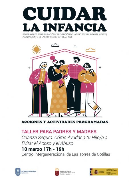 El próximo lunes 10 de marzo (17:00 horas) el Centro Intergeneracional de Las Torres de Cotillas acogerá el taller gratuito "Crianza segura: cómo ayudar a tu hijo/a a evitar el acoso y el abuso". Organizado por la Concejalía de Servicios Sociales, se dirige a padres y madres que quieran aprender herramientas y estrategias para proteger a sus hijos del abuso sexual, así como fomentar una crianza segura y responsable.