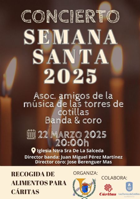 Este sábado 22 de marzo (20:00 horas) la asociación Amigos de la Música de Las Torres de Cotillas celebrará en la iglesia de Nuestra Señora de la Salceda su tradicional concierto de Semana Santa. Con la colaboración de la Concejalía de Cultura, en él participará la banda de la asociación, dirigida por Juan Miguel Pérez, y su coro, comandado por José Berenguer.