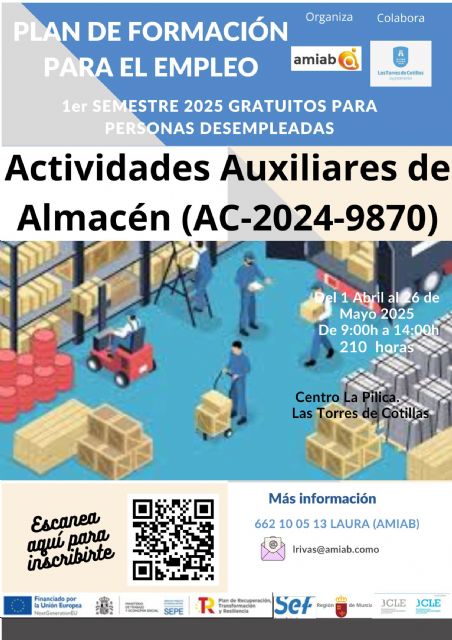 La Concejalía de Empleo y Formación coordina un curso gratuito de actividades auxiliares de almacén que se desarrollará en el centro municipal de La Pilica del 1 de abril al 26 de mayo. Con horario de mañana (de 9:00 a 14:00 horas), esta formación contará con un total de 210 horas lectivas y se dirige a personas desempleadas.