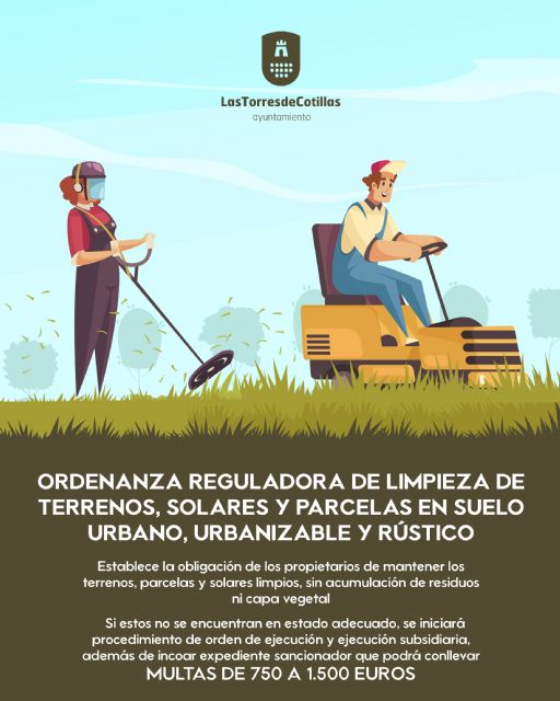 El Ayuntamiento de Las Torres de Cotillas, a través de la Concejalía de Protección Sanitaria, ha puesto en marcha una campaña informativa para recordar a la ciudadanía la obligación de mantener en condiciones óptimas de limpieza y salubridad los espacios de propiedad privada ubicados en el municipio. "La ordenanza municipal establece la obligación de los propietarios de mantener los terrenos, parcelas y solares limpios, sin acumulación de residuos ni capa vegetal", explica el concejal Francisco Juan Giménez, que informa que se ha informado por carta a todos los propietarios.
