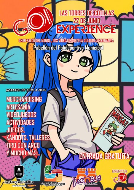 Este domingo 22 de junio llega a Las Torres de Cotillas "Go! Experience", un evento dedicado al mundo del manga, los videojuegos y la cultura alternativa. De 11:00 a 19:00 horas el pabellón del polideportivo municipal acogerá esta cita organizada por la Concejalía de Juventudy Deportes, que contará con entrada gratuita.