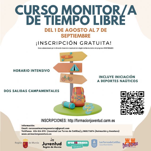 La Concejalía de Juventud propone del 1 de agosto al 7 de septiembre en el Albergue Municipal un curso gratuito de monitor de tiempo libre para mayores de 17 años, que estará subvencionado por la Dirección General de Juventud.